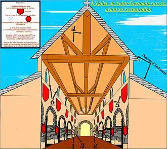 La nef apparaît pauvre et dépouillée face à la richesse du chœur. Mais un autre type d’expression artistique s'y illustrait : la peinture murale. C’est au cours de la restauration du milieu du XXe siècle, que l’on mit en évidence cette décoration. La nef était alors recouverte d’un enduit lui donnant uniformément une couleur blanche. La décision fut prise de laisser les pierres apparentes et de décaper cette couverture[14]. Lors de cette opération les ouvriers ont découvert plusieurs blasons armoriés. Ils ne furent pas identifiés, seules leurs positions ont été relevées par les soins de l'abbé Auguste Lefort. Ils étaient à mi hauteur entre les arches et les fenêtres romanes comme le montre le schéma[32]. Ainsi, les bienfaiteurs de l’église avaient le droit de faire figurer leur blason familial contre une participation financière à l’entretien et à la protection de l’église.