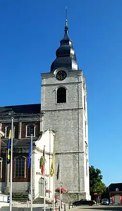 À l'ouest, l'église présente une belle tour édifiée entièrement en pierre de Gobertange[8],[2] assemblée en petit appareil.