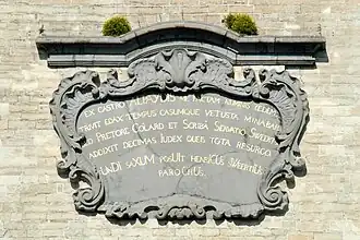 Sous la fenêtre du second registre, la tour porte un grand cartouche en pierre bleue à l'abondante décoration de style rococo (Louis XV) affichant le texte latin ci-dessous ainsi que le chronogramme évoqué plus haut[3],[4].