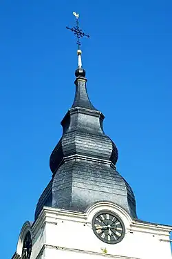 Le quatrième et dernier registre, nettement plus petit que les registres inférieurs, porte une horloge sur chaque face et est surmonté d'un élégant clocher à bulbe couvert d'ardoises[3],[4],[6].