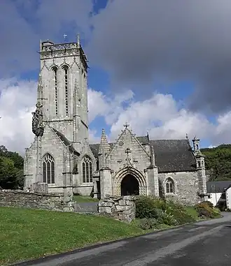 Les deux grandes phases de construction de l'édifice peuvent être distinguées par les différences d'appareil de la construction : l'édifice primitif a été bâti en petit appareil de schiste bleu, de grès et de quartzite, avec un peu de pierre de taille de granite de Brennilis pour les piliers, les bords de fenêtres et les angles, tandis que les travaux de la fin du XVe siècle et de la première moitié du XVIe siècle ont été réalisés en grand appareil de granite du Huelgoat et de Brennilis[6]. Le front sud est composé de la chapelle Sainte-Barbe avec la tour, puis le collatéral éclairé par une petite lucarne, puis le grand porche méridional et enfin le chevet[7].