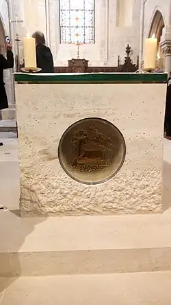 Le maître-autel actuel, conçu par Jean-Paul Mauduit, architecte chargé de la restauration de l'édifice, est taillé dans un bloc de pierre extrait des carrières de Saint-Maximin, dans un banc similaire au calcaire dur et résistant des anciennes carrières de Bagneux, aujourd'hui fermées. Il renferme un reliquaire de saint Hermeland, sous un médaillon en verre soufflé représentant l'Agneau mystique, faisant face à l'assemblée des fidèles. Il est consacré par Matthieu Rougé le .