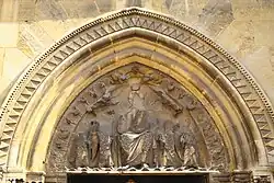 Au tympan mutilé lors de la Révolution française figure le Jugement dernier en calcaire taillé en haut-relief, thème fréquent du XIIe siècle. Ces sculptures furent ensuite recouvertes d'une couche de plâtre avant d'être dégagées au cours des restaurations de la façade en 1844 par l'architecte Claude Naissant (1801-1879).