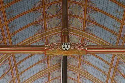 L'église dispose de voûtes en bois, appelées « couvrement ». Cet espace lambrissé accueille des peintures de couleur azur et des ornements rouges et or. Ce décor est redoublé par des éléments de charpente apparents, peints et sculptés. On remarque notamment des engoulants, têtes de dragon sculptées à chaque extrémité des entraits. L'édifice est en partie dédié à la Vierge Marie. Le couvrement du vaisseau central de la nef est peint de litanies mariales. Dans les vaisseaux latéraux, les couvrements imitent, à la fois par l'ajout de moulures en bois et de peintures, la présence de croisées[2].