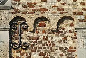L'abside présente trois registres étagés en hauteur. Le premier registre est rythmé par quatre pilastres qui séparent des pans de maçonnerie faits de moellons de grès blanc et de grès ferrugineux assemblés en appareil irrégulier. Le second registre, dont la maçonnerie est identique, présente un léger retrait par rapport au premier registre dont il est séparé par un cordon de pierre. Ses quatre pilastres plus fins s'élancent de ce cordon pour rejoindre la frise d'arcs sur modillons géométriques située sous le troisième registre, et agrémentée aux extrémités de deux grandes ancres de façade en forme de lettre X. Au niveau du deuxième registre, l'abside est percée d'une grande fenêtre axiale à simple ébrasement, dont les piédroits harpés portent un arc en plein cintre aux claveaux polychromes. Le troisième et dernier registre, orné d'un appareil de grès blanc et brun beaucoup plus régulier, est percé d'une fine meurtrière au linteau monolithe en forme de mitre et surmontée d'une croix de pierre.