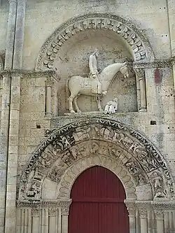 Le mur latéral nord : se distingue par ses sculptures. Le cavalier en haut-relief, dans une niche, symboliserait la victoire de Constantin Ier sur les païens, surmonte la représentation du combat des vices et des vertus, sur le rouleau externe de l'arc. L'actuelle sculpture date majoritairement d'une restitution de 1872, seule la partie centrale est authentique. Cette scène n'est pas unique puisqu'elle se trouve sur les façades d'autres églises de la région : Airvault, Parthenay-le-Vieux, Civray, Aulnay-en-Saintonge. Il y a une porte obturée au niveau du transept, son linteau est une pierre de remploi d'origine Gallo-romaine, on peut encore y voir dessus un médaillon avec un couple en buste.