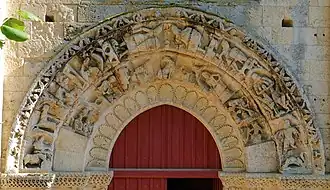 Dans la quatrième travée du bas côté droit, un très beau portail est décoré à l'intérieur, ce qui est rare. Son arc est formé de 31 claveaux sculptés. Au centre, un christ bénissant de la main droite. Il tient dans l'autre main le livre de la Sagesse. À sa droite saint Pierre brandit une clé, tandis que les autres personnages tiennent un livre.