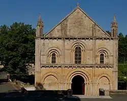La façade occidentale : épaulée aux angles par deux faisceaux de colonnes surmontés d'élégants clochetons à flèches. Le portail central en tiers-point est flanqué de deux arcatures aveugles. Au-dessus, un bandeau de palmettes s'appuie sur de grands médaillons sculptés. Il passe sous trois fenêtres en plein cintre richement décorées.