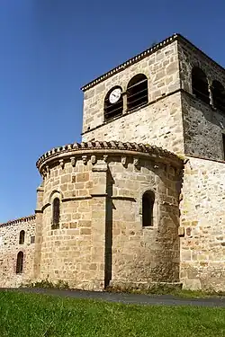 À l'est, l'église présente un chevet roman constitué d'une abside semi-circulaire. Rythmée par de puissants contreforts amortis en bâtière qui prennent appui sur un soubassement haut de quelques assises, cette abside est percée de trois fenêtres cintrées reliées par une frise en damier qui court sur toute l'abside.