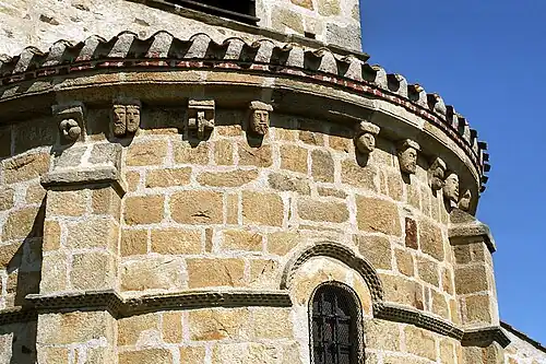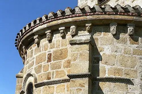 L'abside est couronnée d'une corniche moulurée soutenue par des modillons sculptés alternant motifs géométriques et visages humains (dont un double), et couverte de tuiles orange comme le reste de l'édifice.