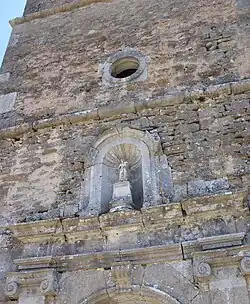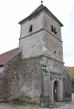 L'église comporte un imposant clocher-tour carré à trois niveaux. Le portail de style roman est encadré par deux colonnes à chapiteau de syle ionique. Ce portail est surmonté par une niche romane avec une voûte en plein-cintre présentant une vierge à l'enfant en pierre.