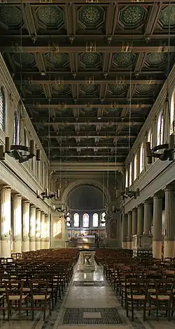 La nef est séparée des bas-côtés par un alignement de colonnes doriques, cannelées dans leur partie supérieure, qui supportent une rangée de fenêtres hautes. Le vaisseau central est couvert d'un plafond à caissons en bois peint.