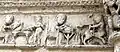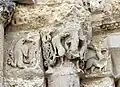 Les chapiteaux s'inscrivent dans la grande tradition romane. Foisonnants de représentations symboliques (coquilles Saint-Jacques), de monstres mythiques issus du bestiaire médiéval (basilics, chimères, sirènes-oiseaux, griffons), d'animaux exotiques (lions) ou de visages humains énigmatiques[2], ils se rapprochent par certains aspects de l'art des imagiers d'Aulnay et de Saintes. Un des chapiteaux de la façade représente un centaure en train de décocher une flèche en direction d'un cerf. Comme le cerf symbolise généralement le Christ, le centaure incarnerait ici le mal.