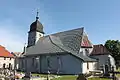 L'église est de plan allongé et possède trois nefs en voûtes d'ogive[1]. Le clocher est surmonté d'un dôme à l'impériale, typique de la Franche-Comté ; l'église est couverte d'un toit à longs pans qui a la particularité d'être métallique[1].