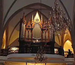 Le buffet de l'orgue est de style néogothique adapté au style de l'église. Doté de quarante-trois tuyaux de façade, il est en chêne massif et repose sur une tribune de style baroque avec balustrade en fer forgé. L'instrument pèse 7 tonnes et utilise 1 800 tuyaux en étain et en sapin, répartis sur deux étages. La transmission est de type pneumatique tubulaire (sommiers à pistons). La console est orientée vers le chœur[3].