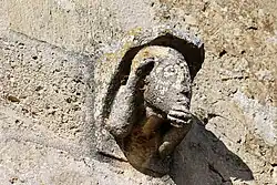 - sur le mur sud de la nef, subsiste un seul modillon, de remploi, représentant le buste d'un homme dont la main droite touche ses cheveux et la main gauche caresse sa barbe. Sans doute est-il le seul rescapé parmi les modillons romans qui ornaient la corniche de la nef lors de la reconstruction de ce mur en 1785. « Toucher ses cheveux » était une représentation de la Vanité ; « toucher sa barbe » avait un sens sexuel.
