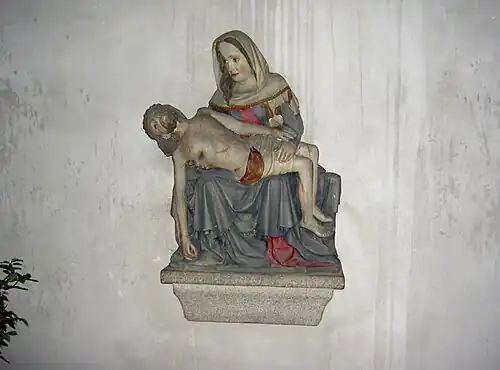 Au sud, il y a un grand bas-relief de grès patiné d'environ 1400 représentant la Descente de Croix et la Mise au tombeau du Christ. À l'extérieur de la chapelle Sainte-Anne, l'on remarque des représentations de l'Homme des douleurs en buste du premier tiers du XVe siècle et la tête d'une statue féminine, probablement du début du XIVe siècle.
