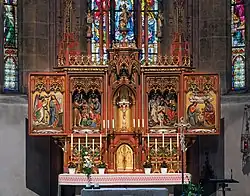 Le maître-autel néo-gothique avec des sculptures de bois date de 1868 ; il a été réinstallé en 1978 après avoir été ôté dans les années post-conciliaires. Il montre des représentations de l'Annonciation et de l'Adoration des Mages, du sermon de saint Jean-Baptiste et du baptême du Christ, au dos des images des ailes latérales la flagellation et le couronnement d'épines du Christ.