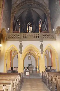 La triple nef courte de l'église possède de hautes claires-voies, des arcades trapues et est accessible par l'entrée principale sur le côté Sud vers le marché. Le chœur Est et le chœur Ouest montrent un plan en 5/8, qui jouxte directement la nef. Les différentes sections du vaisseau telles que le transept et l'arche de croisée de chœur sont mises en évidence par la conception différenciée des piliers et des gabarits muraux.