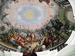 L'intérieur s'inscrit dans une forme ovale. Les angles sont arrondis par des niches et les murs sont en courbe. Huit piliers puissants légèrement en avancée se présentent par deux. Une large corniche soutient la coupole ovale, donnant au petit espace de la nef un aspect de monumentalité classique. L'effet est accentué par la noblesse des fresques.