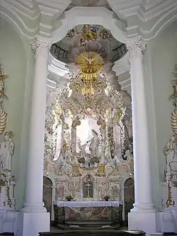 Le maître-autel datant de 1754-1755 est des mains de Nikolaus Schütz, d'après un dessin de Dominikus Zimmermann. Sa structure de bois est ornée de stucs. Les statues sont l'œuvre de Johann Luidl. Quatre piliers de stuc en trompe-l'œil imitant le marbre s'élèvent en se transformant en rocailles, flammes et coquilles, l'ensemble étant orné d'arabesques. La scène centrale représente le Baptême du Christ par saint Jean, sous une colombe symbolisant le Saint Esprit. Le décor du Jourdain est peint sur les murs.