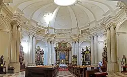 La façade est basée sur le modèle de l'église principale des Carmélites de Santa Maria della Scala à Rome.