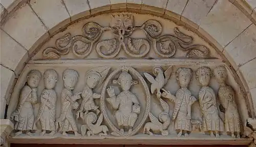 Le tympan est sans linteau. Sur sa partie supérieure et au centre, une gueule de monstre jette des rinceaux. Faut-il y voir un symbole de la puissance de la parole divine : le monstre (un lion ?) représentant la force et la puissance, les rinceaux, la propagation du verbe divin ? Sa position au sommet du tympan, au-dessus de Christ pourrait accréditer cette interprétation.