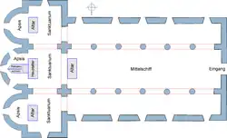 L’église de l'abbaye est installée dans une salle à trois nefs. La salle était accessible à l’ouest par une porte monumentale.