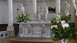 Le maître-autel construit en 1903 est en marbre blanc incrusté de mosaïques et de bas relief en marbre de Carrare. Les sculptures du maître-autel représentent, au centre, le repas de Jésus avec les disciples d'Emmaüs. À gauche saint Joseph tenant en main le lys symbole de pureté et de droiture. À droite saint Jean-Baptiste, revêtu de sa peau de chameau. Le tabernacle est entouré de deux statues représentant Saint Pierre à gauche et Saint Jean à droite.