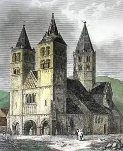 Une première église de plan quadrangulaire est construite sur le site à l’époque carolingienne, vers l’an 800[2]. Elle est remplacée vers le début du XIe siècle par un nouvel édifice plus grand et doté d’un clocher-porche[3].