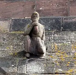 Quatre statues, appelées marmousets, représentant des hommes accroupis se trouvent sur les glacis de la tour de croisée. Leur signification n'est pas certaine[5]. Au-dessus du porche d'entrée se trouve le tympan : le Christ est représenté trônant et bénissant. Il est entouré de saint Léger et de la Vierge. Cette dernière est représentée couronnée puisqu'elle est la reine des Cieux. Saint Léger, lui, est représenté nimbé. Il tient un phylactère qui devait originellement être peint.