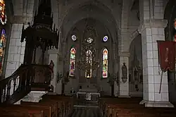 La totalité de l'édifice est construit en brique, cependant en entrant, c'est un édifice de pierre que l'on découvre. Cela est dû au fait que l'intérieur est recouvert d'un enduit imitant la pierre. Ce genre d'enduit était très prisé au XIXe siècle puisqu'il permettait de masquer les défauts inévitables de construction. En effet, l'église étant un édifice à la gloire de Dieu, il n'est pas pensable d'imaginer que la maison de Dieu soit imparfaite donc pour donner l'impression que l'édifice est la perfection, on recouvre les murs d'un enduit imitant un appareillage parfait.