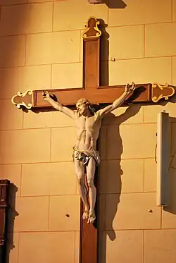- Christ en croix : Le Christ est maintenu sur la croix par un clou dans chaque paume de main et un clou au niveau des pieds. La tête est penchée vers son côté droit, les yeux sont clos, la langue est visible. La plaie est sur son côté droit. Le périzonium, à plis horizontaux, est attaché sur le côté droit du Christ. La sculpture du Christ en ivoire date du XVe siècle, elle était classée[17] le .