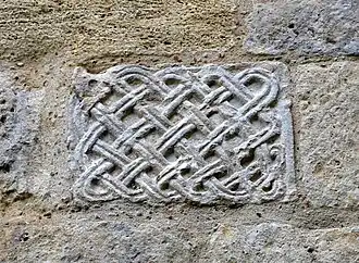 - Sur le contrefort nord de la façade occidentale se trouve une pierre sculptée avec un entrelacs classique.