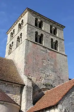 Tour carrée à deux étages, présentant sur chaque étage et sur chaque face deux baies géminées à double ouverture d'une grande élégance. Il est situé à la croisée du transept. Il reste des traces de l'incendie de 1359 sur les pierres du clocher. Souvenir de la guerre de Cent Ans dans la région.