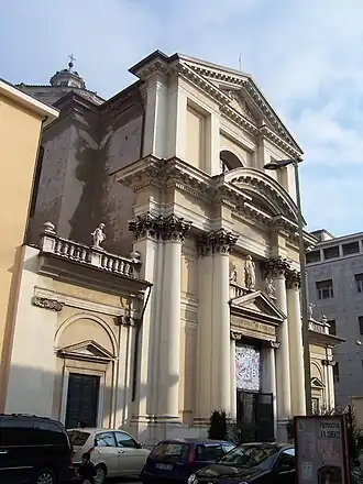 Une église paroissiale était précédemment située sur le site depuis le XIIIe siècle puis reconstruite en 1751–1763 dans le style baroque d'après des plans de Domenico Corbellini[1]. Le plan de la nef en croix latine est surmonté d'une coupole octogonale surmontée d'une lanterne.