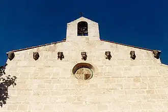 La partie haute de la façade est percée d'un oculus, surmonté d'une remarquable série de sept corbeaux : les trois corbeaux du centre représentent des têtes d'animaux alors que les deux corbeaux de gauche et les deux corbeaux de droite figurent chacun un visage d'homme. Détail curieux : la tête d'animal située au centre (juste au-dessus de l'oculus) porte une couronne, tout comme la tête d'homme située à l'extrême droite.