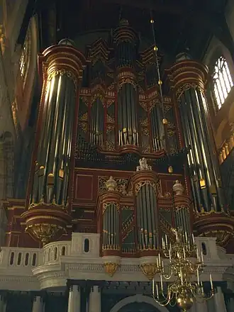 L'orgue de tribune est construit par Marcussen en 1973 et comprend 84 jeux (7 486 tuyaux) répartis sur 4 claviers et pédalier. C'est l'un des plus grands orgues à traction mécanique du monde. Le buffet principal mesure 12,2 mètres de large. Il est situé entre deux tours mesurant chacune 10 mètres de haut renfermant la tuyauterie de la pédale. Il comprend six jeux d'orgue espagnol en chamade ainsi qu'un bazuin (trombone) 32' et plusieurs dizaines de rangs de mixtures. Le premier orgue a été achevé en 1644, il comprenait 44 jeux sur trois clavier et pédaliers. En 1790 un nouvel instrument est commandé au facteur Andreas Wolferts de Dordrecht, mais ne fut achevé qu'en 1828 par les facteurs Heinemann, Freytag et Meere qui ont poursuivi les travaux de Wolferts. En 1845, le facteur Bätz améliore l'instrument et le porte à 72 jeux. C'est cet instrument qui sera détruit en 1940.