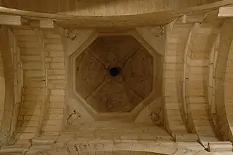 L'intérieur possède à la croisée du transept une coupole sur trompes[12] : elle est ornée des symboles des Évangélistes[14] sur les trompes et de colonnes sur la coupole elle-même.
