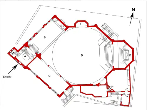 Légende du plan : A- Porche sous le tour-clocher B- Narthex C- Ancienne chapelle de la Vierge D- Nef surmontée d'une coupole E- Autel F- Niche-chapelle