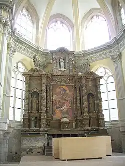 Le chœur abrite un retable de la seconde moitié du XVIIe siècle en bois, qui possède des colonnes torses et à balustres creuses. Malheureusement, l'autel a été comme pour le reste de l'église arraché[3][Quand ?][Quoi ?].