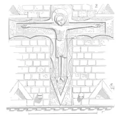 - Le Christ en croix en très bas-relief, provenant du pignon de la façade occidentale et monté sur le mur occidental avant le classement en 1912, date du dernier quart du XIIe siècle. Il se compose de plusieurs éléments en pierre calcaire taillée et polie, et mesure 192 cm de haut et 150 cm de large. Une croix semblable, mais sans Christ, figure toujours sur la façade de la Basse-Œuvre de Beauvais. Une autre existait jadis à Bresles[32].