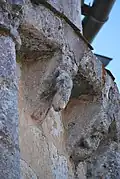 On distingue parmi les modillons des têtes d'hommes et d'animaux, des personnages et des quadrupèdes dans diverses positions, une tète d'homme buvant dans un baril, un homme dévoré par une tête monstrueuse, enfin des disques ou roues sans rayons. Pour plus d'information sur ces thèmes classiques voir Iconographie des modillons romans.