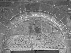 On peut y apercevoir une croix pattée centrale, une chèvre, un chien, un animal fantastique avec deux gros yeux ronds, un poisson, un damier, une chaîne et des guirlandes. Seuls les chapiteaux des piliers latéraux sont décorés.
