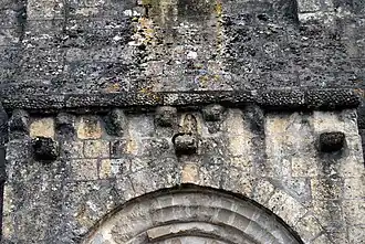 Un semis de petits étoiles tapisse la corniche, qui repose sur huit modillons totalement informes. Entre les deux consoles médianes, se trouve une métope datant du XIe siècle : une femme y donne le sein à deux serpents, symbole classique de la luxure.