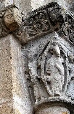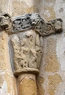 Le tailloir a bien résisté à l'érosion. On y voit une frise ou alternent des animaux, des masques cracheurs de rinceaux et des feuilles palmées.