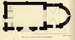 Le fond de la nef est divisé en trois compartiments : l'un comporte les fonts baptismaux, l'autre le passage pour la porte occidentale avec probablement le bénitier et celui du milieu est vide. Dans le chœur, on aperçoit des traces de fenêtres romanes au nord, bouchées et remplacées par d'autres dans la surélévation des murs. Le chœur est bien séparé de la nef par un arc triomphal brisé et un mur épais de chaque côté de l'arc. À la retombée de l'arc triomphal, au nord, le chapiteau roman est historié.