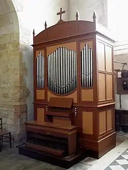 Entretenu par les manufactures Claus, Gaudu puis Sévère, ce petit instrument compte un clavier avec pédalier à l'allemande en tirasse. La console est en fenêtre, la traction mécanique. Le buffet s'organise autour d'une plate-face centrale de 15 tuyaux, la base étant incurvée et le sommet trilobé. De part et d'autre, deux plates-faces présentent chacune cinq chanoines (faux tuyaux en bois peint) logés sous une arcade ogivale également trilobée[2].