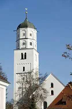 En 1547 Erhard Vöhlin fait don de la chapelle latérale nord. L'église est remplacée en 1590 par un bâtiment plus grand. Le clocher est rehaussé de deux étages octogonaux.