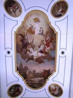 L'église est à nef unique. Le vaisseau principal, plus large, à plafond plat, est nettement séparé du chœur voûté qui se prolonge en une abside polygonale. Deux autels latéraux, accolés de chaque côté au mur séparant la nef du chœur, accentuent cet effet. Les murs latéraux sont ornés d'une série de grandes statues colorées, tant dans la nef que dans le chœur.